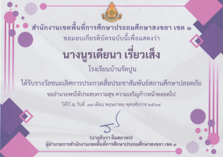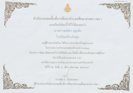ครูต้นแบบ ช่วงชั้นที่ 1 (ป.1-3) โครงการ การพัฒนารูปแบบการนิเทศการสอนโดยใช้ PATHITTA Model เพื่อพัฒนาความสามารถในการสื่อสารภาษาอังกฤษในห้องเรียนภายใต้กระบวนการ PDCA |